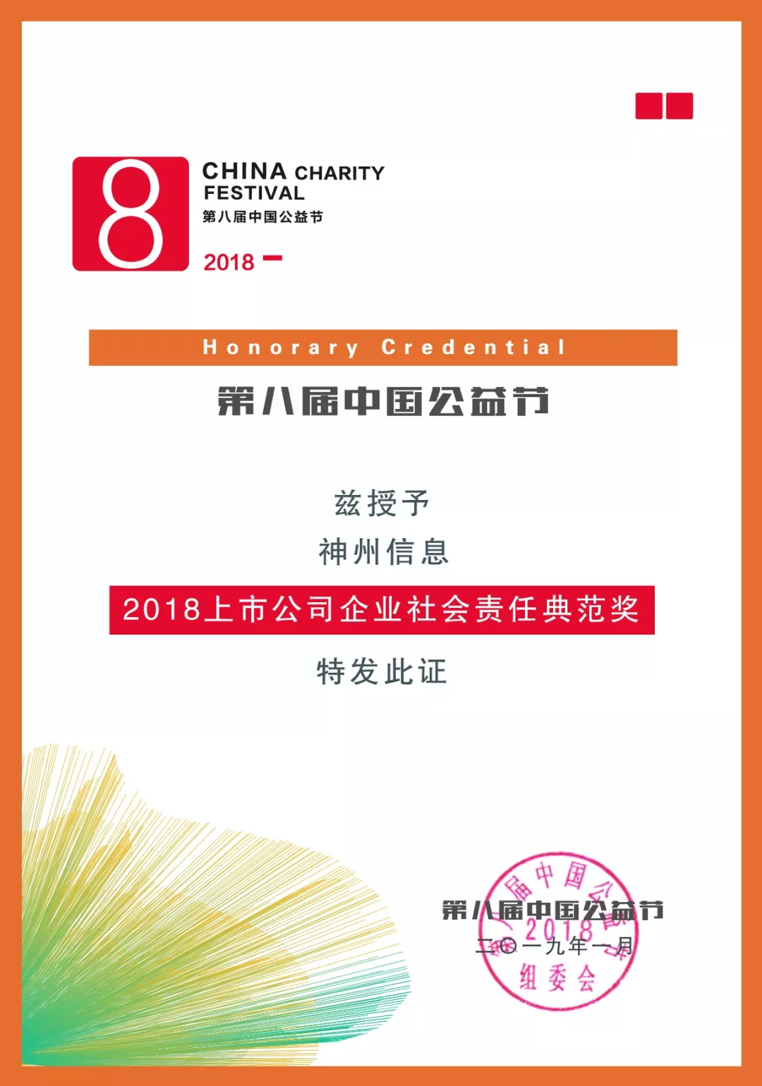 第八届中国公益节,神州信息获评“2018上市公司企业社会责任典范奖”